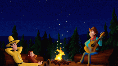 Curious George and the Man with the Yellow Hat enjoy a starry night by a campfire, with music and singing.