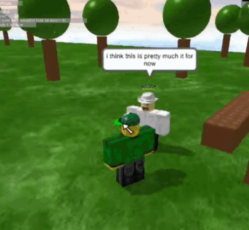 Cappy and Rochas camp in Roblox, with Cappy saying 'I think this is pretty much it for now' by a campfire.
