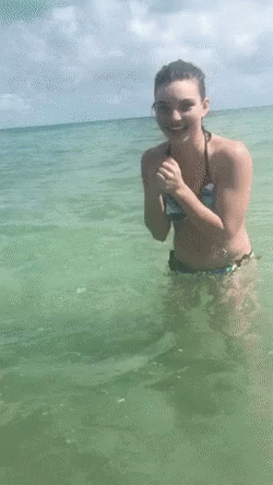 Camren Bicondova smiles and splashes water while standing in the clear ocean, enjoying a sunny day.