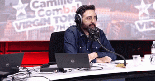 Camille Combal, host of Virgin Tonic, sitting at a desk with headphones and a microphone in a radio studio.