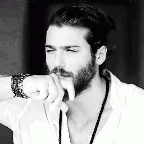Can Yaman in a thoughtful pose, wearing a white shirt and necklace, captured in black and white.