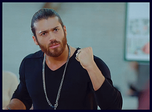 Can Yaman as Can Divit, wearing a black shirt and necklace, raises his fist with an intense, motivated expression.