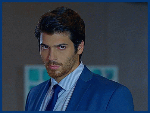 Can Yaman as Ferit Aslan, looking intensely at the camera in a blue suit and tie from the series Dolunay.