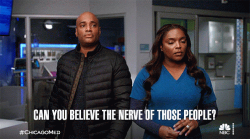 Maggie Lockwood and Ben Campbell react, asking 'Can you believe the nerve of those people?' in a hospital setting.