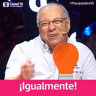 A man on Canal 10's Pasapalabra game show gives a thumbs up and says '¡Igualmente!'