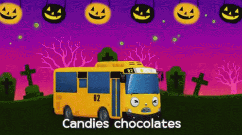 Tayo the Little Bus celebrates Halloween with a witch, Frankenstein, Dracula, and a mummy collecting candies and chocolates.
