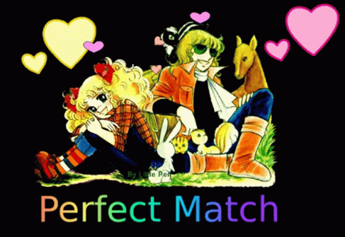 Candy Candy and Albert are a perfect match in this animated image, surrounded by hearts and text.