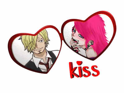 An animation featuring Sanji and Sonia (Sansoni) in heart shapes, merging into a single heart with kiss marks.