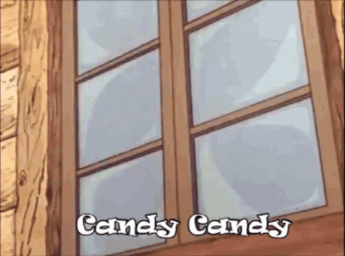 Classic anime character Candy Candy, with text 'Candy Candy' on screen, smiling and waving from a window.