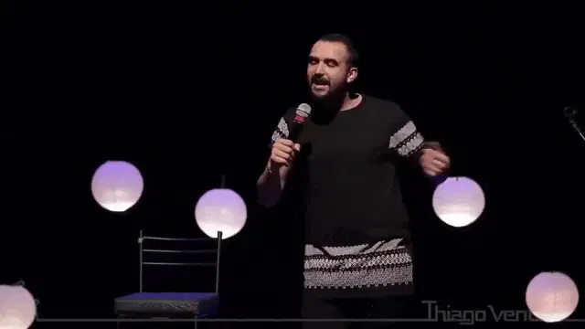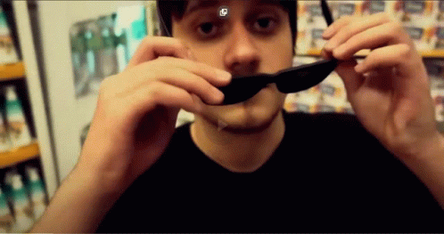Matheus, as Canella Putz, wears sunglasses and a 'P' sticker on his forehead, making a funny face.