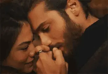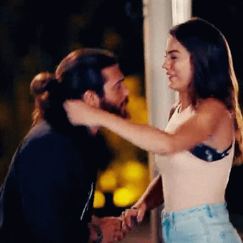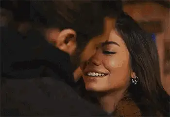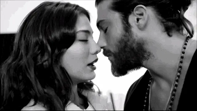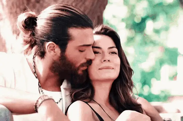 Can Yaman and Demet Özdemir share a passionate kiss and embrace, holding each other closely.