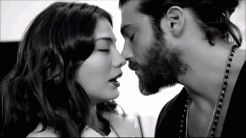 Canem from Erkenci Kus share a tender, intimate moment, noses touching in a close embrace.