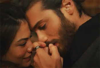 Can and Sanem share a tender, intimate moment, with Can kissing Sanem's hand.