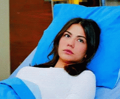 Canem Sanem, played by Demet Ozdemir, lies in a hospital bed looking sad and unwell.