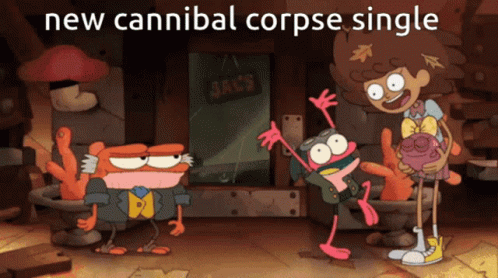 Characters from the animated series Amphibia are featured in a meme referencing a 'new Cannibal Corpse single'.