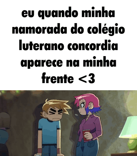 A young man reacts as his girlfriend from Concordia Lutheran College appears, in a scene reminiscent of Scott Pilgrim animation.