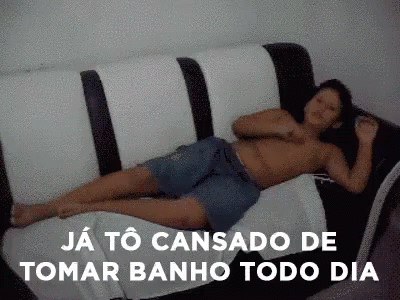 A young boy complains he's tired of taking a shower every day, lying shirtless on a couch.