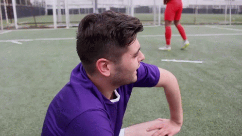 A male soccer player in a purple shirt and white shorts collapses onto the artificial turf field, appearing exhausted after play.