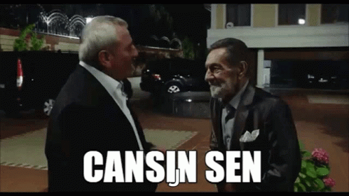 Two men, including Cansin Sen, interacting with the Turkish caption 'CANSIN SEN' (You are) on screen.