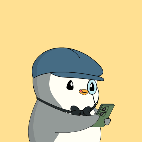 An adorable Pudgy Penguin wearing a blue cap and bow tie, engrossed in its smartphone with hearts floating around.