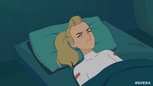 Adora from She-Ra struggles to sleep, covering her ears and head before sitting up wide awake and surprised.