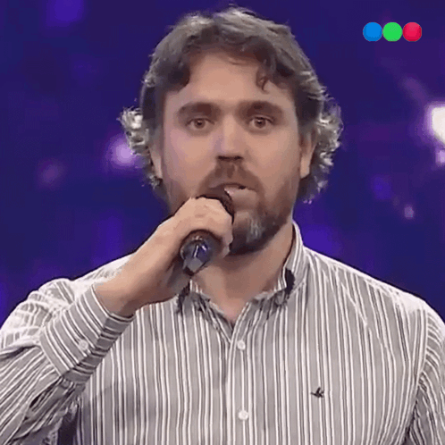 Hernan Quinteros performs opera on Got Talent Argentina, singing into a microphone while wearing a striped shirt.