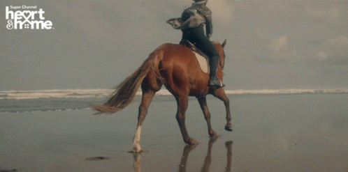 A person rides a brown horse at a canter along a wet, reflective beach, with a 'CHANNEL sport home' logo.