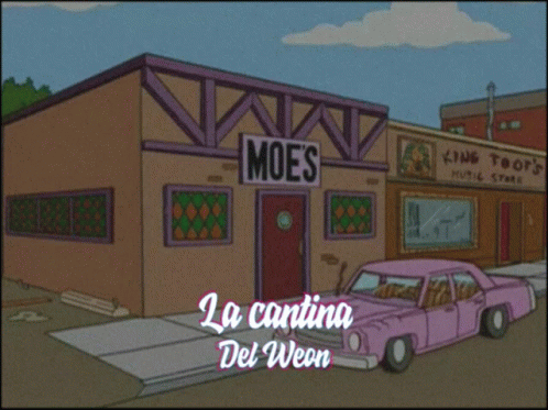 Animated scene of Moe's Tavern with a pink car outside, featuring the text 'La cantina Del Weon' and Discord branding.