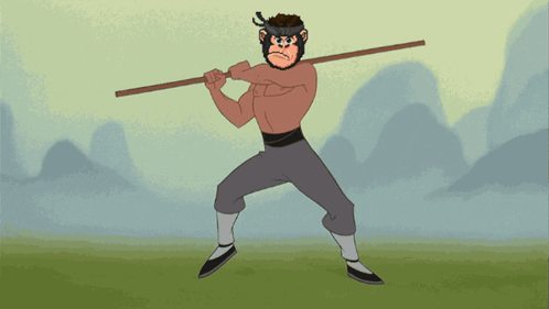 Pota from Flufworld demonstrates powerful kung fu training, breaking a stick with a staff in a dynamic cartoon scene.