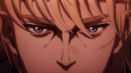 Close-up of Canute from Vinland Saga, showing his intense blue eyes and blonde hair.