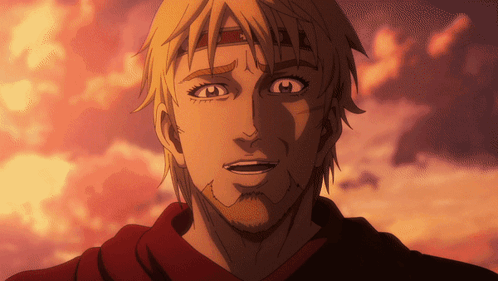 Canute from Vinland Saga Season 2 shares an emotional laugh in a field at sunset.