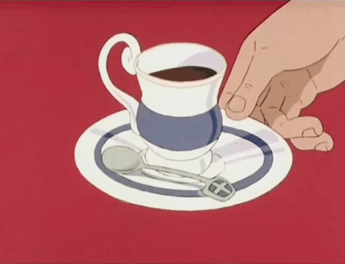 An animated hand places a white and blue coffee cup with a spoon on a saucer.