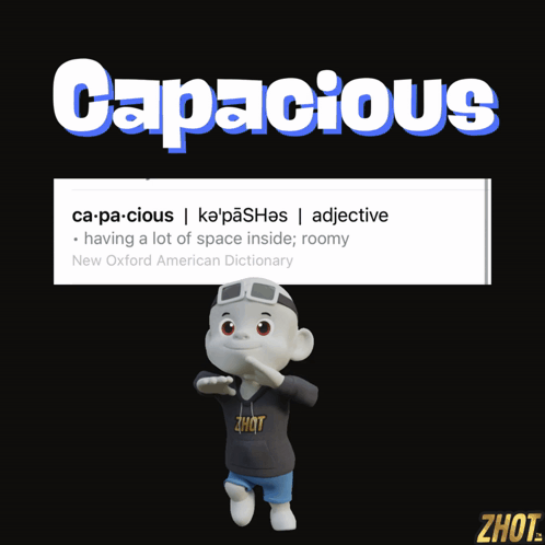 Animated character dances as the definition of "Capacious" (having a lot of space inside; roomy) is displayed.
