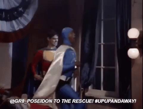 Gr8poseidon, the superhero, attempts a comedic rescue, comically falling over before a city view.