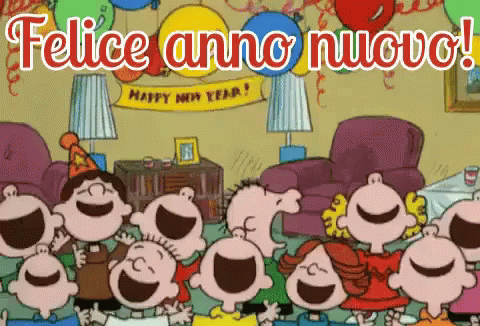 Peanuts characters, including Charlie Brown, celebrate New Year's Eve with balloons and a 'Happy New Year!' banner.
