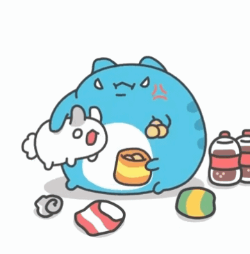 Capoo Tutu, the cute, fat character, is shown angy and large, eating crisps.