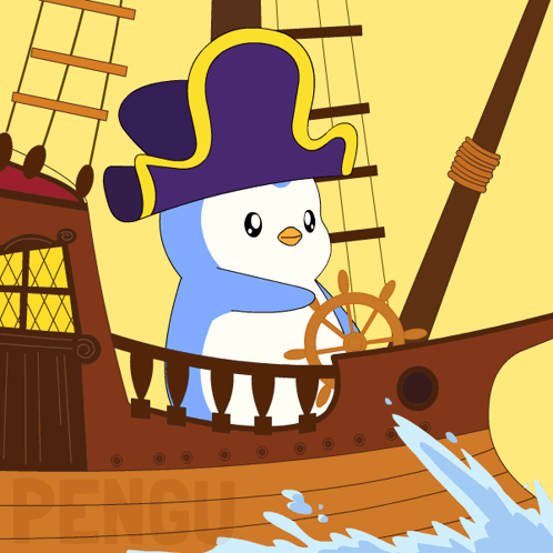A cute Pudgy Penguin pirate steers a ship, with the text "SHIP IT!" appearing on screen.