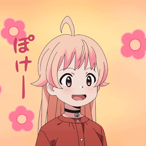 Anime girl Nico Wakatsuki with pink hair and a choker, surrounded by pink flowers, showing a dazed expression.