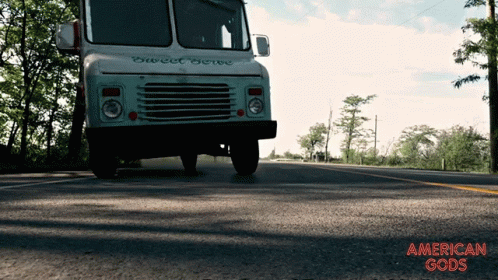 A 'Sweet Serve' truck performs a wheelie before flipping over on a road, from the show American Gods.
