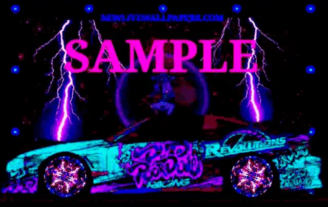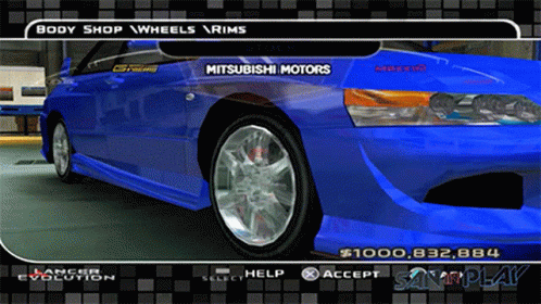 A blue Mitsubishi Lancer Evolution is shown in a video game's body shop, customizing wheels and rims.