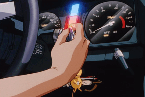 An anime-style hand turns a car key in the ignition, attempting to start the engine as the RPM gauge moves.