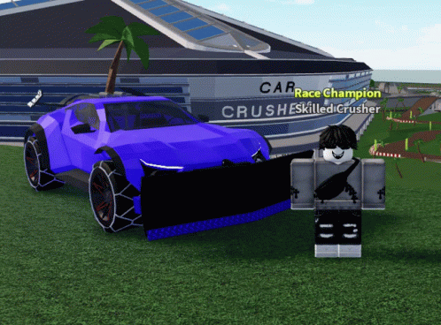 A Roblox player stands next to a customized blue sports car with a snowplow in Car Crushers 2.