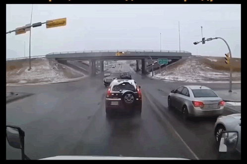 A car Kgsad navigating a snowy intersection with other vehicles and an overpass in the background.