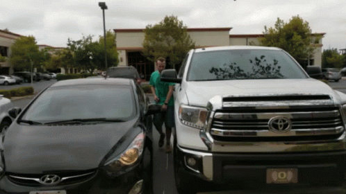 A man struggles to get into his black Hyundai car, which is parked extremely close to a white Toyota Tundra truck.