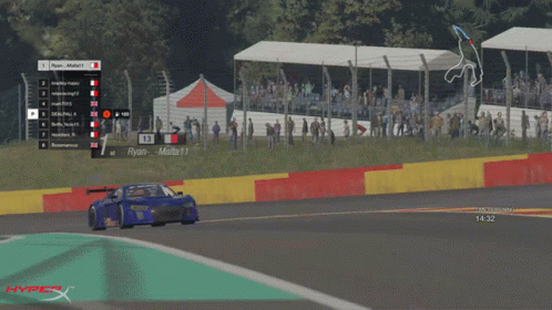 Blue Audi R8 LMS GT3 sports car speeds around a race track, with 'Ryan--Malta11' in the lead.
