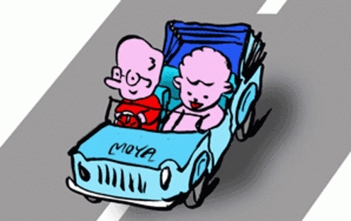 A cartoon drawing by Patrick Moya featuring a man and a baby in a blue jeep with 'MOYA' written on its side.