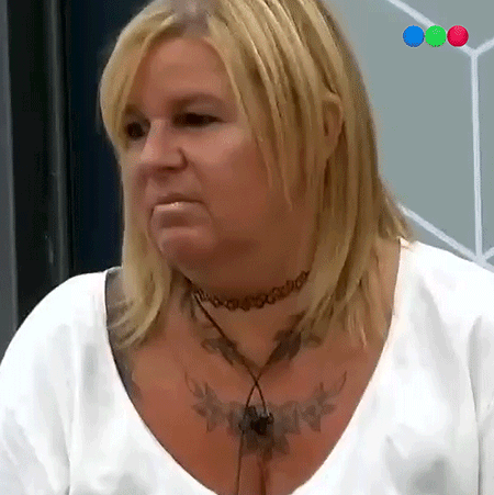 Virginia from Gran Hermano Argentina shows a displeased expression, wearing a choker and chest tattoos.