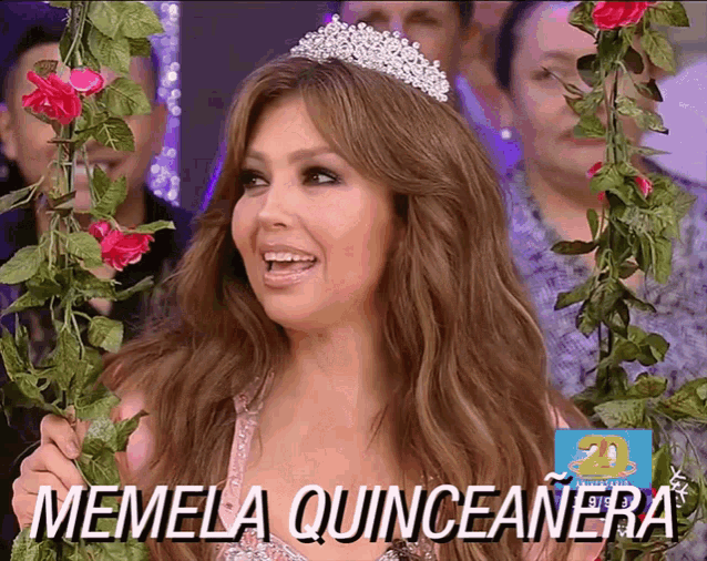 Thalia, wearing a tiara, celebrates her 'Memela Quinceañera' in a lively and expressive moment.