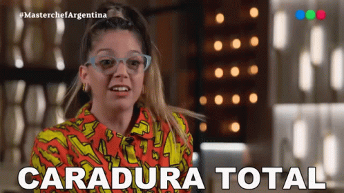 Juariu, wearing glasses and a colorful shirt, exclaims 'Caradura Total' on Masterchef Argentina.