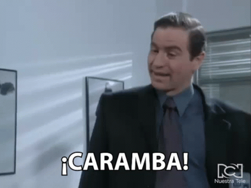 A man from the show 'Yo Soy Betty La Fea' exclaims 'Caramba!' with a surprised expression.